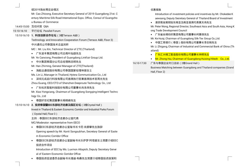 交流會(huì)上進(jìn)行粵港澳大灣區(qū)與泰國(guó)合作發(fā)展研討暨廣東省企業(yè)未來發(fā)展計(jì)劃介紹,廣東省商務(wù)廳副廳長(zhǎng)陳越華先生作主持。廣東省發(fā)展與改革委員會(huì)主任、推進(jìn)粵港澳大灣區(qū)建設(shè)領(lǐng)導(dǎo)小組辦公室主任葛長(zhǎng)偉先生帶來《共享粵港澳大灣區(qū)發(fā)展新機(jī)遇、推動(dòng)廣東與泰國(guó)合作發(fā)展》的主題分享,珠海格力電器股份有限公司董事長(zhǎng)董明珠女士、科大訊飛科大訊飛股份有限公司高級(jí)副總裁杜蘭女士介紹企業(yè)未來在泰國(guó)合作發(fā)展及投資計(jì)劃。交流會(huì)還進(jìn)行《粵港澳大灣區(qū)建設(shè)背景下粵港與泰國(guó)合作發(fā)展機(jī)遇》研討沙龍環(huán)節(jié),與泰國(guó)政商界代表共同探討促進(jìn)廣東和泰國(guó)雙方的交流與合作。