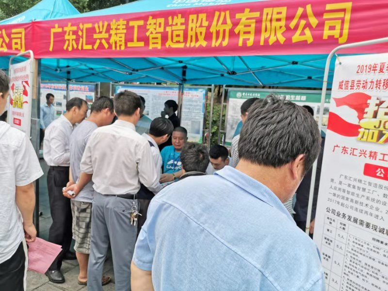 由威信縣委、縣政府,東莞市大嶺山鎮(zhèn)黨委、政府主辦,威信縣人社局、東莞市大嶺山鎮(zhèn)人社分局承辦的“2019年夏季東莞市大嶺山鎮(zhèn)對(duì)口幫扶威信縣農(nóng)村勞動(dòng)力轉(zhuǎn)移就業(yè)專場(chǎng)招聘會(huì)”在云南威信縣體育館廣場(chǎng)隆重舉行。此次招聘會(huì)有來(lái)自廣東省大嶺山鎮(zhèn)的名優(yōu)企業(yè)10余家,大嶺山鎮(zhèn)提供就業(yè)崗位500余個(gè)。招聘會(huì)現(xiàn)場(chǎng)氣氛熱烈,其中匯興智造集團(tuán)招聘位置前排成長(zhǎng)長(zhǎng)的隊(duì)伍,應(yīng)聘者禮貌有序地排隊(duì)填寫應(yīng)聘表。