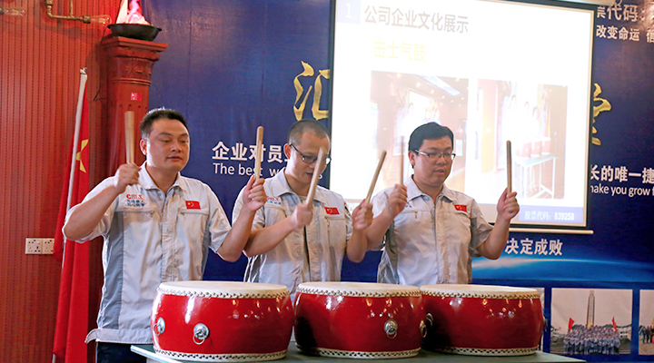 會議由行政部經(jīng)理袁侃主持。會議在激昂的《匯興之歌——用心智造世界》 拉開帷幕,全體參會人員向企業(yè)核心價值觀“孝道、商道、人道”行三鞠躬禮,宣讀企業(yè)愿景——成為全球領(lǐng)先的整廠自動化系統(tǒng)解決方案提供商,企業(yè)使命——做受尊敬的好人、造受尊敬的產(chǎn)品、辦受尊敬的企業(yè)、建受尊敬的平臺,企業(yè)精神——用情做人、用心做事,團隊精神——忠誠團結(jié)、勤奮進取。隨后,匯興智造干部職員代表鐘建輝、彭大海,鄭建團共同敲響士氣鼓,鼓舞匯興智造牢記初心,砥礪前行。
