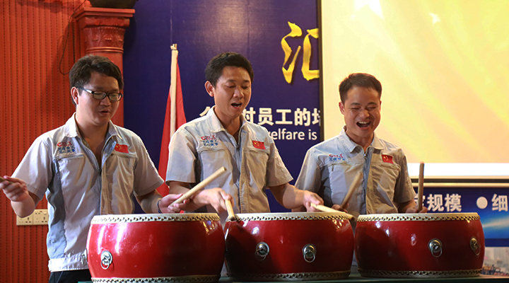 隨后,東莞分公司廠長歐陽輝鳳、智能裝備研發(fā)中心工程師鐘揚(yáng)、裝配測試技術(shù)員劉洋「三陽開泰」共同敲響士氣鼓、鼓舞匯興智造奮勇前進(jìn)。