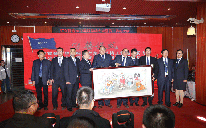 晚會現(xiàn)場,匯興智造董事會、監(jiān)事會成員登臺舉行宣誓儀式,為2018沖鋒表決心、擂戰(zhàn)鼓,確保公司在2020年前實現(xiàn)效率倍增、業(yè)績倍增、效益倍增,成功登陸創(chuàng)業(yè)板。儀式結束后,宣誓成員們圍繞在梁培浩教授贈送的畫作《大吉大利》周圍,借用畫上8只憨態(tài)可掬的小狗送出“旺狗賀歲、歡樂祥瑞”的祝福。8,既代表2018,也代表“發(fā)”,祝福匯興智造在2018大發(fā)展,創(chuàng)新高。