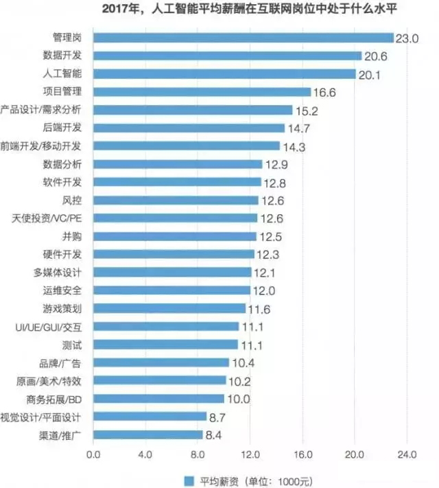 數(shù)據(jù)顯示,管理崗在各崗位中薪酬最高,平均達(dá)到 23k,數(shù)據(jù)開發(fā)和人工智能緊隨其后,都在 20k 以上。