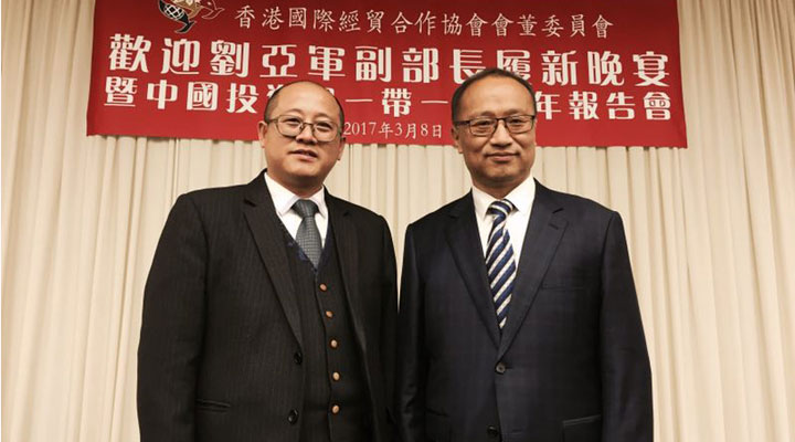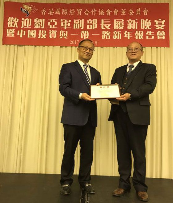 2017年3月8日,匯興智造董事長(zhǎng)鐘輝受邀參加由香港國(guó)際經(jīng)貿(mào)合作協(xié)會(huì)會(huì)董委員會(huì)在港島陽(yáng)明山莊舉辦的“歡迎劉亞軍副部長(zhǎng)履新晚宴暨中國(guó)投資與一帶一路新年報(bào)告會(huì)”。