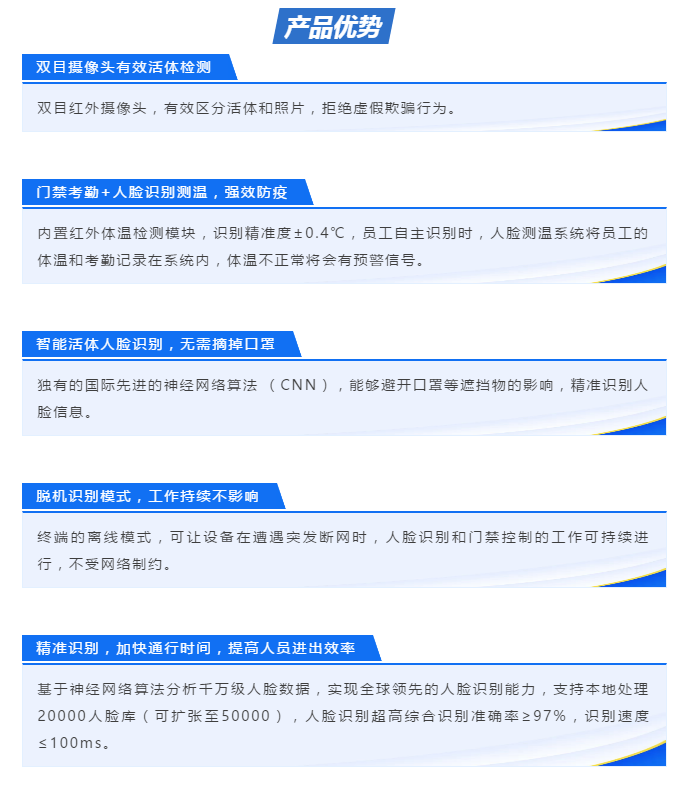 用國際先進的神經(jīng)網(wǎng)絡(luò)算法 (CNN), 是經(jīng)數(shù)千萬次的算法訓練后形成的產(chǎn)品,其集圖像采集、人臉檢測、人臉跟蹤和人臉比對等功能,不僅識別率高,同時識別速度快。值得一提的是,這款設(shè)備可以輕松識別出戴口罩的人臉信息,非常適合作為此次疫情防控的有力工具。