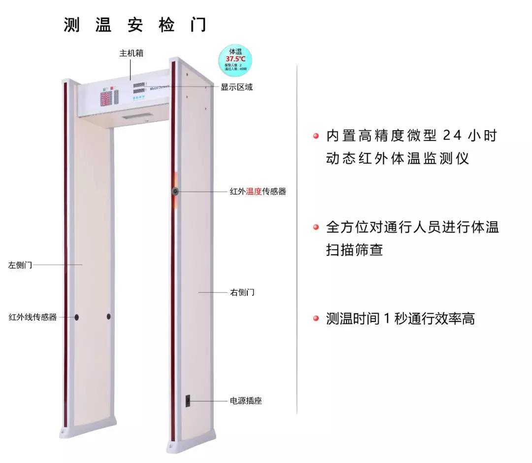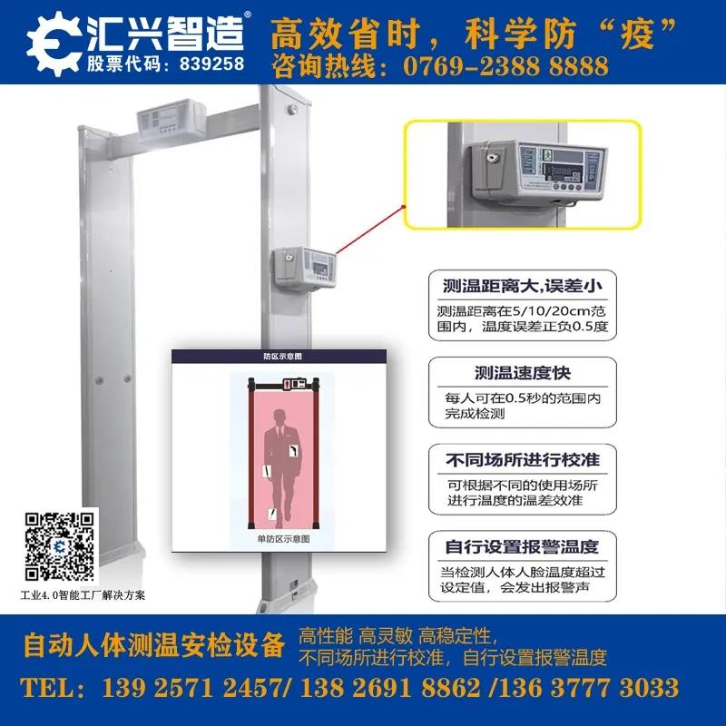 匯興智造人體測溫安檢門將集紅外測溫和金屬檢測為一體化,可對通過安檢門的人員進行溫度測試,如若超過安全溫度閾值將聯(lián)動安檢門聲光報警,有效對人員進行篩查并建立首道防線。
