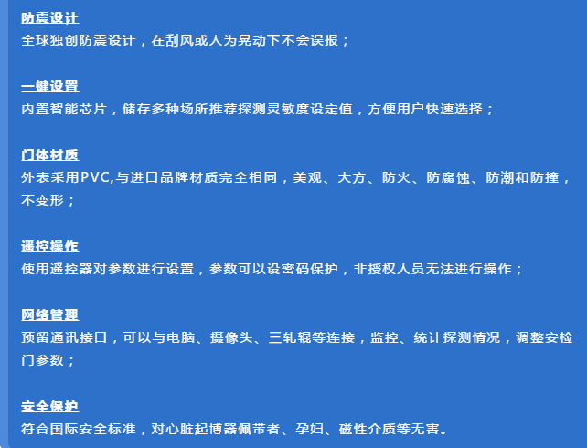 該設(shè)備采用世界先進的電磁兼容設(shè)計和抗震動設(shè)計,具有超高靈敏度、極強的抗干擾能力和抗震能力,適用于管制刀具和槍支等危險物品的安全檢查,廣泛應(yīng)用于監(jiān)獄、法院、學校、醫(yī)院、電子企業(yè)、港口、客運站、展覽會館、會議中心、重大慶典、演唱會等重要場所。