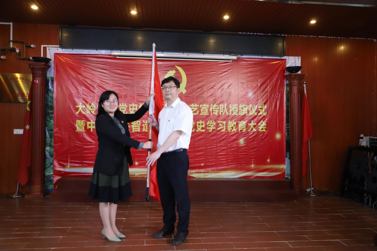 鎮(zhèn)委委員葉淑帆出席并為大嶺山文化服務(wù)中心黨支部書記楊繼春授“黨史學(xué)習(xí)教育文藝宣傳隊(duì)”隊(duì)旗。鎮(zhèn)宣教文體旅辦、文化服務(wù)中心、黨建工作辦、宣傳文化線代表及匯興智造員工代表約100人參與了活動(dòng)。