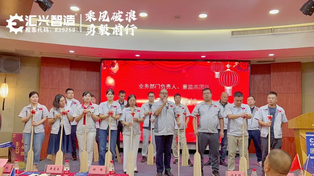 參會(huì)現(xiàn)場董監(jiān)高上臺(tái)在沒有任何彩排的情況下,進(jìn)行劃龍舟展示,在鐘董的指揮下,整齊劃一的劃動(dòng)船槳。意在把團(tuán)結(jié)拼搏、奮勇向前的龍舟精神轉(zhuǎn)化為推動(dòng)匯興智造高質(zhì)量發(fā)展的動(dòng)力,激勵(lì)大家在干事創(chuàng)業(yè)的賽道上,拼出精彩,拼出未來。